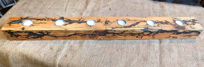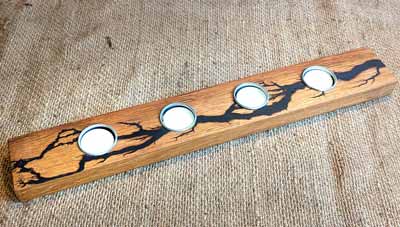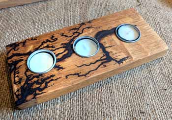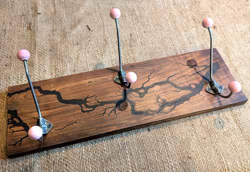 The creators, both named Matt combine their skills of joiner and electrician using fractal burning to create to burn dendritic designs into the wood which is then used to create a range of furniture and other functional items such as coat racks, charcuterie and serving boards. Timber is all locally sourced and seasoned at their Eldwick premises or salvaged from other uses