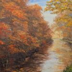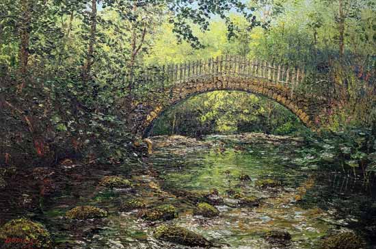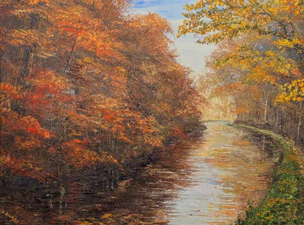 Oil paint is very thickly applied (impasto) with a painting knife to produce a three-dimensional, almost sculpted, image. This not only adds great depth but produces a surface that responds subtly to the changing light of the environment in which the work is displayed