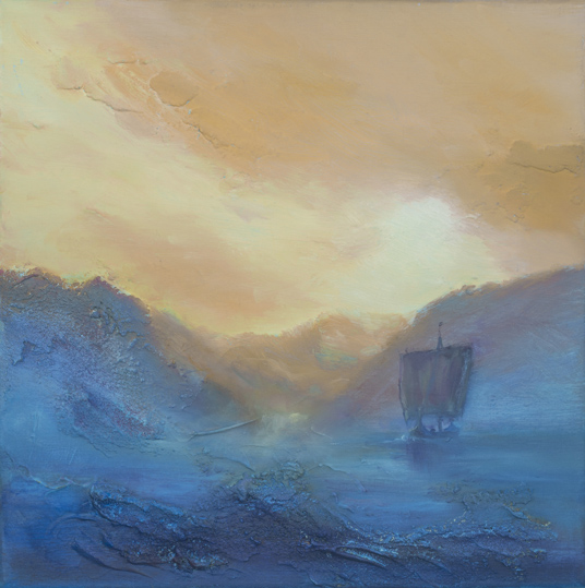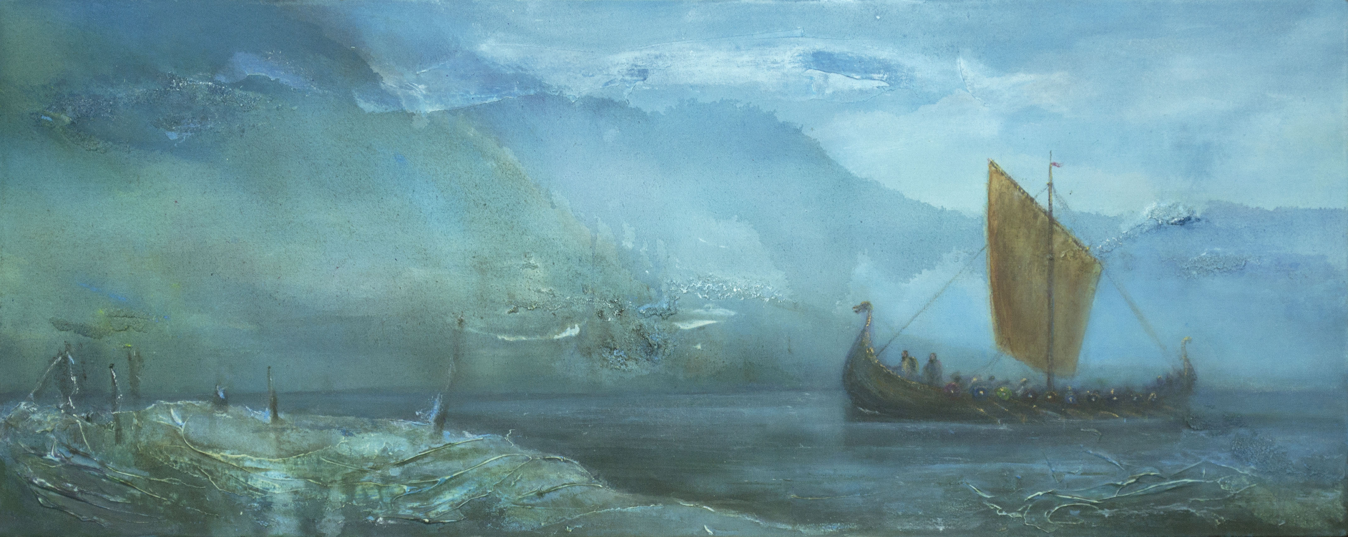 The Bingley Gallery’s next exhibition features Leeds-born artist Clarke Avery. Painting in a range of media including oils, acrylic and texture gel, Clarke conjures up atmospheric and often dramatic scenes. It’s something that interacts directly with the on-looker’s emotions. There’s a historical element too, perhaps inspired by Clarke’s studies in Archaeological Scienceat the University of Bradford: The nineteenth century schooners, caught in storms or becalmed against fiery sunsets; Viking longships emerging from mist amongst icy landscapes; ruined castles on headland and the wolves and ravens of Norse mythology. In Clarke’s own words the style of painting is “experimental with expressive brushstrokes, strong colours and textures” There’s a high degree of abstraction within the landscapes, contrasting with the detail of the focal subject matter. There’s something reminiscent of John Martin’s early nineteenth apocalyptic artwork, with humanity dwarfed by the forces of nature. Clarkes paintings will be accompanied in the show by a range of 3D art by other artists from the region including free-form ceramics from Nettleton Pottery, which combine gorgeous, deeply glazed, internal colour with exteriors impressed with the texture of family heirloom textiles, Mandy Long’s dynamic figurative sculptures and StatorArt’s remarkably beautiful creations made from reclaimed electric motors.
